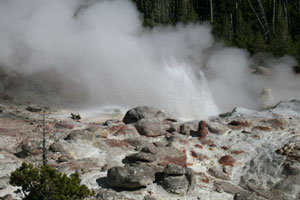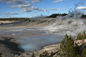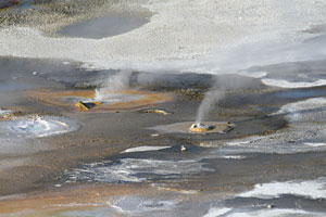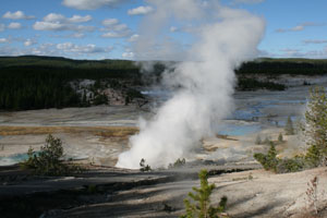 Ein Tanz auf dem Vulkan - was kann man sich mehr zum Geburtstag wünschen! Beschwingt machen wir uns auf zum aktivsten Gebiet dieses Hotspots, zum Norris Basin. Hier gibt's mehr Erdbeben als in den anderen Teilen des Parks, der Boden hat sich hier in jüngerer Vergangenheit merklich gehoben. Ausgerechnet heute wird ja wohl nichts von geologischer Bedeutung abgehen, kein lange ruhender Geysir neben uns in die Luft fliegen, sich Erdspalten auftun oder die riesige unter uns schlummernde Magmablase zur Oberfläche wollen. Zwar ist gemäß eines festgestellten Zyklus von
