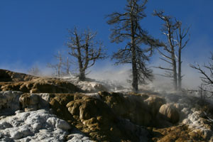 Recht farbenfroh präsentiert sich die Palette Spring gleich beim ersten Parkplatz hinterm Camp. Apart sehen auch die flankierenden in Dampfschwaden gehüllten Kiefern gegen den tiefblauen Himmel aus. Wir müssen viele Japaner fotografieren, einzeln, in Gruppen, Paare. Die meisten setzen sich nett vor den wabernden Terrassen in Szene, manche wollen den lustigen Liberty Cap, einen erloschenen Geysir,