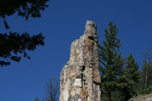 Kurz vor der Tower Junction führt eine kleine Stichstraße zum "Petrified Tree", einem versteinerten Riesen-Redwood. Erstaunlich ist, dass er noch (zumindest ein passables Stück Stamm) aufrecht am Hang steht nach all den Millionen Jahren in Power-Vulkan-Gesellschaft. Den alten Baumstamm lassen wir dann aber fast unbeachtet und im wahrsten Sinne des Wortes erst mal links liegen.