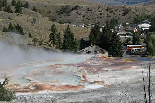 Blick auf die Mammoth Hot Springs Lodge