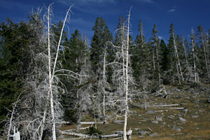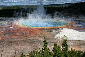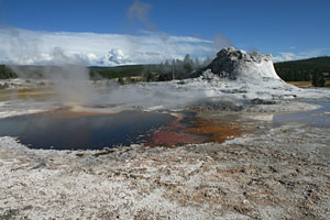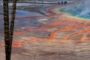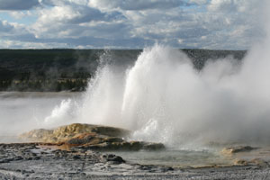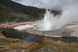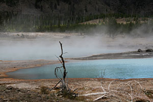 Bei einer Rast mit Blick auf die weißen Gespenster abgestorbener Kiefern - in den aktiven Basins werden sie irgendwann von Silicium gekillt - scheinen wir unbeabsichtigt gleich Zeuge der Grand-Geyser-Eruption zu werden. Eine geführte Gruppe Japaner ist im eiligen Anmarsch. Besonders spektakulär wird's dann nicht, er hat wohl gerade