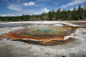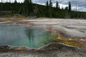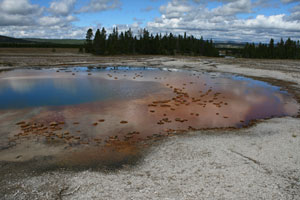 Ausgesprochen schillernde Gesellen sind der Chromatic und Beauty Pool, die uns lange in ihrem Bann halten. Dumm, dass die Zeit so verfliegt und uns zu allem Überfluss langsam die Füße weh tun. Irgendwas im Zusammenhang mit dem Morning Glory Pool haben wir missverstanden: In der Annahme, dass er eh' nur in der Früh so strahlend rüberkommt wie überall abgebildet, beschließen wir, dort nicht mehr hinzulaufen - wäre noch über einen Kilometer hin (und wieder zurück). Wir nehmen uns vor, ihm morgen von Norden her einen Besuch abzustatten.