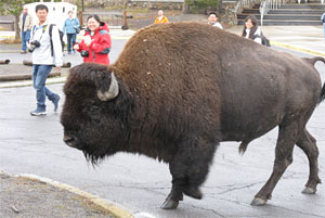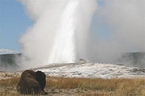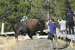 Zum Abschluss unserer Runde erleben wir unseren Old Faithful mit Bilderbuch-Ausbruch, die Menge tobt und jauchzt. Unser Bison treibt sich auch noch herum - belagert von Schaulustigen, wartet er geduldig auf eine Möglichkeit, etwas ungestörter den Holzsteg beim Camp zu überqueren. Wir trauen unseren Augen nicht.