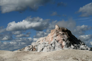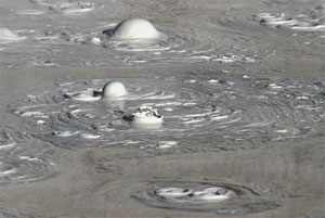 Dem gemütlich vor sich hinblubbernden Schlammloch mit zartrosa Rand könnten wir stundenlang zugucken. Träge steigen dicke Blasen, etwas flotter die kleinen aus der zähflüssen Suppe auf und zerplatzen dann in den tollsten Formen. Wir freuen uns wie die Schneekönige, so etwas endlich mal aus nächster Nähe zu erleben. (Der Besuch beim