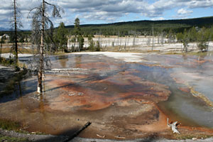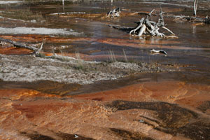 Weiter geht es nun den kleinen Loop Drive entlang zum Fountain Paintpot. Der Weg vom Parkplatz ins Basin führt mitten durch zauberhafte pastellige und kräftig rostrote Wasserspiegelungen. Eisen ist hier die vorherrschende Ablagerungsform - die blassen, knorrigen Stümpfe der