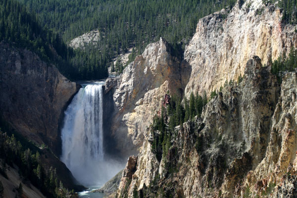 Unser erstes Tagesziel, den Grand Canyon of the Yellowstone, erreichen wir wegen diverser Bisonstudien erst kurz nach Mittag. Offenbar haben wir uns für hier nicht gut vorbereitet (zählte nicht zu unseren Prio-A-, lediglich zu den "gucken wir uns aber auch an"-Zielen). Die zahlreichen Zufahrtsmöglichkeiten zum Canyon verwirren uns etwas, wir landen zunächst am Aussichtspunkt Upper Falls. Zu sehen gibt's einen ganz hübschen Wasserfall, am Parkplatz unseren Mammoth-Cabin-Nachbarn sowie einen lustigen Oldtimer und einen Raben, der hingebungsvoll die Scheibenwischer eines Pickups zerlegt.
