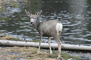 Wir fahren weiter, den See und die Westthumb-Bucht entlang, die der Krater einer gewaltigen Eruption vor 162.000 Jahren und der Bereich ist, wo Lake Yellowstone mit 146 Metern am tiefsten ist. Mitunter lässt es sich nicht vermeiden, einen Stau zu verursachen - so wie wir, auch noch in einer Kurve. Der kleine Maultierhirsch am Seeufer ist viel zu nett um einfach vorbeizufahren, zumal wir bisher nur seine größere Verwandschaft zu Gesicht bekommen haben. Unser Auto passt gerade so in eine winzige Bucht hinterm Seitenstreifen. Nachfolgenden Schaulustigen, die sich bald einfinden, bleibt nicht anderes übrig, als die Straße zu blockieren. Stoppen steckt hier einfach an.