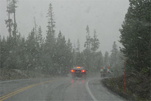 die Straße ist gesperrt. Uns schwant Übles. Die Strecke zum Old Faithful ist frei, dafür bekommen wir auf Höhe der Continental Divide den ersten Schneefall ab.