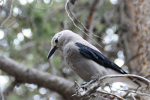 anderem auf den hässlichen Lake Village Hotelkasten. Kaum ausgestiegen, findet sich ein weiterer Gast ein, ziemlich frech rückt er uns auf die Pelle. Offenbar freut sich der Kiefernhäher, dass wieder mal Fressbares hier ausgepackt wird - und wir freuen uns, dass er so ausgiebig für Fotos posiert. Dass er sich unseren letzten Keks vom Tisch schnappt, haben wir - zugegeben - nicht verhindert, aber als Revierinhaber einer Picknick-Area sollte er ein solches Häppchen ohne gröbere Schäden wegstecken können.